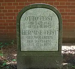 Hermine Wohlheim was the daughter of the Jewish coal wholesaler Caesar Wollheim and his wife Caroline, née Pollack. Her sister Martha (1857-1942) later married the ophthalmologist Max Reichenheim, while her sister Else (1858-1904) was married to the chemist and industrialist Franz Oppenheim, the chairman of the Agfa board. She married the merchant Otto Feist (1847-1912),[1] the son of a tradesman in Frankfurt am Main and had three children Paul (1882-1886), Ernst (1884-1939) and Hans (1887-1952). The latter died shortly after his release from the Oranienburg concentration camp.[2][3]
