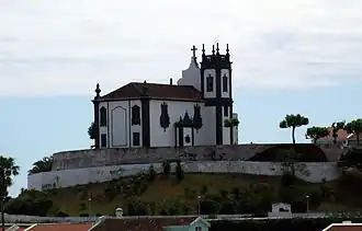 Located in an isolated urban context, implanted on an elevated hilltop over the historic Fort of Mãe de Deus, with plastered walls, relatively close to the University of the Azores.[1] The church's frontal access is marked by a basalt staircase of two flights, flanked by rectangular plinths, plastered and painted in white, caped by faceted pillars and two orders of plinths.[1] The courtyard is covered in sod, and dotted by trees.[1]