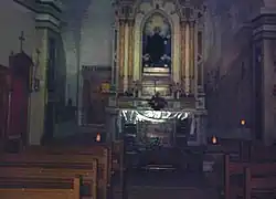 The church has a single nave. The neo-Gothic style altar is notable, with a wooden statue of Saint Dominic in a niche and a marble paliotto from 1761 at its base, created by Giuseppe Mancini commissioned by Francesco Iafolla, a hermit from Villalago.