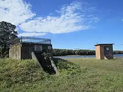 Hexham is located just upstream of the Hunter River delta and its various islands, and as such it was a relatively convenient place for crossing to the north bank of the river. A punt was established in the 1800s, followed by a steam punt, which eventually carried motor traffic. As traffic levels grew after World War I, Hexham became a bottleneck for road traffic. A decision was made in the late 1930s to construct a bridge, however construction was delayed by World War II. Eventually the first two-lane bridge was opened in December 1952.[10][11] The first bridge is a steel truss bridge with a central lifting span, designed to allow shipping to travel upstream. By the 1970s, this bridge was becoming a bottleneck and the decision was made to increase capacity by building a second bridge for all northbound traffic. This concrete high-level fixed bridge was built just upstream of the original bridge (converted to carry southbound traffic only) and was opened in August 1987.[12][13]