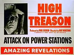High Treason is a 1951 British spy thriller.[3][4] It is a sequel to the film Seven Days to Noon (1950) from the same team. Director Roy Boulting, co-director (with his brother John) and co-writer of the first film also directed and co-wrote this one.[4] Frank Harvey, Boulting's co-writer, was also a co-writer of the earlier film. André Morell reprises his role as Detective Superintendent Folland of Scotland Yard's Special Branch from the first film, though in High Treason he is subordinate to the head of Special Branch, Commander Robert "Robbie" Brennan, played by Liam Redmond.[5]