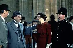 David Suchet (Poirot) and Hugh Fraser (Hastings) in the 14 January 1990 episode of Agatha Christie's Poirot; Hill House boys in the school’s famous burgundy knickerbockers are visible in the background