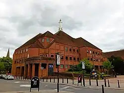 Derbyshire's design envisaged a diamond-shaped building to the west containing the offices of the council officers and their departments and a more irregular-shaped building to the east containing the public areas including the council chamber, the civic suite and register office.[8] The main frontage to the public areas, facing onto the High Street, featured a loggia with eight entrances and a steep roof, with a two-storey block with a clock tower behind.[1] The design made extensive use of brick and tile, to pay homage to traditional homely brick architecture of nearby buildings and suburban developments that were "indigenous to the borough".[15][16] It was designated a Grade II Listed Building in April 2018.[1]