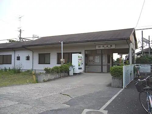 Hinaga Station (日永駅, Hinaga-eki) is a railway station on the Yokkaichi Asunarou Railway Utsube Line and the Yokkaichi Asunarou Railway Hachiōji Line in Yokkaichi, Mie Prefecture, Japan, operated by the private railway operator Yokkaichi Asunarou Railway. It is 1.9 rail kilometers from the terminus of the Utsube Line at Asunarou Yokkaichi Station and is a terminal station for the Hachiōji Line.[1]