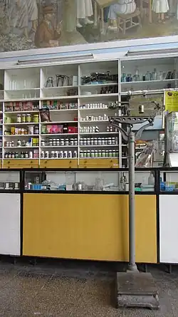 The mural is composed of three large sections, corresponding to the left side, central panel, and right side of the pharmacy, as seen from the entrance. The fragment on the left side is also known as "Homage to Medicine: Vaccination," (Homenaje a la medicina: la vacunación) while the right side is called "Homage to Medicine: Natural Medicine" (Homenaje a la medicina: medicina natural).[9] Physically, the work is displayed above the pharmacy shelves, and it should be read in chronological order from left to right.[1]