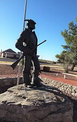 The historic Old Post Cemetery was established in 1877 on the southwest corner of Grierson and Mizner Avenues. The cemetery was moved to its present location on May 18, 1883. Buried are many of the soldiers who perished during the Apache Wars including Apache Scouts and their families. There are over 4,124 U.S. Military Personnel buried in the cemetery. Among the buried are Apache Scout Shorten Bread, one of the Apache Scouts of General George Crook who helped to track Geronimo, and his son Shorten Bread Jr. Miss Carrie A. Clark, who served as postmistress, is also buried there.[11] Also buried in the cemetery is Colonel Louis A. Carter, the only African-American chaplain, who served with all four of the black regiments of the Regular Army.[12] Carter was the second African-American Army chaplain to be promoted to colonel. At Fort Huachuca, he served as post chaplain from 1913 to 1915 and again from 1935 to 1940.[13] There are some unmarked graves outside the cemetery's wall. Criminals were prevented from being buried within the cemetery itself. The "Mourning Hearts, A Soldier's Family", a bronze sculpture by Jessica McCain and presented by the Huachuca Museum Society in 1996, is situated inside the cemetery. The statue depicts a nameless woman and children mourning the loss of her husband, a Soldier with a backdrop of gravestones. The address of the 7.3 acre cemetery is 104 Burt Road.[11][4][14]