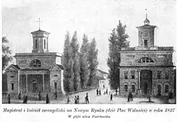 The market square was probably marked out in 1414 during the founding of the city on the initiative of the Włocławek bishops. In 1423, when granting municipal rights, King Władysław II Jagiełło authorized the "weekly market every Wednesday and yearly twice a year". A wooden town hall was built on the market square, later destroyed in unknown circumstances. Another one, created in 1585, survived until the 18th century. The market was re-regulated in 1821 and gradually built up with tenements.[2]