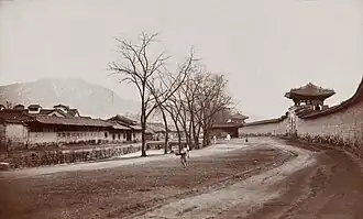 Rather than return to Gyeongbokgung, where Min had been assassinated, Gojong chose to make Gyeongungung (later called "Deoksugung") his primary residence for its proximity to various foreign legations, which he believed could help protect him from Japan.[103] He then declared the establishment of the Korean Empire.[104] Thereafter, Gyeongbokgung was not significantly used by Gojong, although the royal family continued using it for several ceremonies.[105] Several of its structures were demolished and reused for buildings in Gyeongungung.[106] Gyeongbokgung fell into disrepair.[105] A fire broke out in the palace on September 21, 1899, destroying facilities for court ladies and servants.[107] Gojong ordered maintenance on the palace in 1900, 1904, and 1907. However, after 1905, Japan began indirectly ruling Korea, and repairs were subject to approval by the Japanese Resident-General of Korea.[105] Furthermore, Gojong was forced to abdicate in lieu of his son, Sunjong. Sunjong began to use Changdeokgung as his main palace.[108]