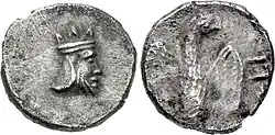 Silver coin (gerah) minted in the Persian province of Yehud, dated c. 375-332 BCE. Obv: Bearded head wearing crown, possibly representing the Persian Great King. Rev: Falcon facing, head right, with wings spread; Paleo-Hebrew YHD to right.