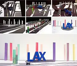 In 2000, the LAX Beautification Design Team,[22] who included LA artists, Paul Tzanetopoulos and Selbert Perkins Design in collaboration with Ted Tokio Tanaka Architects[23] designed a major public art kinetic light installation for the perimeter of the airport, LAX Gateway Pylons, consisting of free-standing translucent, internally-lit glass columns.[24][22]
