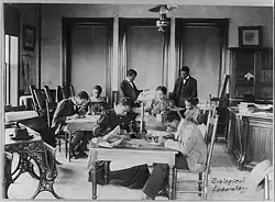 The main building of the new college, called "the college building" was completed in 1893. The multi-purpose building served as dormitories for men and women, food service, classrooms and offices. The building was destroyed by fire in 1930.[4] The college conferred its first degrees in 1899 to W.T.C. Cheek, I.S. Cunningham, and A. Watson receiving Bachelor of Science degrees & A.W. Curtis, E.L. Falkner, J.M. Joyner, and P.E. Robinson receiving Bachelor of Science in Agriculture degrees. The college granted admission to both men and women of color from 1893, until the board of trustees voted to restrict admission to males only in 1901. This policy would remain until 1928, when female students were once again allowed to be admitted.[2] In 1904, the college developed a 100-acre farm equipped with the latest in farm machinery and labor-saving devices. During that time, the university farm provided much of the food for the campus cafeteria.[5] In 1915, the North Carolina General Assembly changed the name of the college to Negro Agricultural and Technical College of North Carolina.[2]