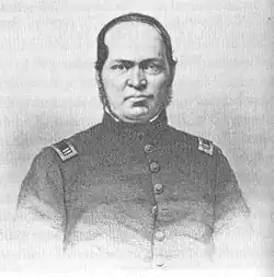 Polish Americans fought in the American Civil War on both sides. The majority were Union soldiers, owing to geography and ideological sympathies with the abolitionists. An estimated 5,000 Polish Americans served in the Union, and 1,000 for the Confederacy.[35] By coincidence, the first soldiers killed in the American Civil War were both Polish: Captain Constantin Blandowski, a Union battalion commander in Missouri who died in the Camp Jackson Affair,[36] and Thaddeus Strawinski, an 18-year-old Confederate who was accidentally shot at Fort Moultrie on Sullivan's Island.[37] Two Polish immigrants achieved leadership positions in the Union Army, Colonels Joseph Kargé and Włodzimierz Krzyżanowski.[38][b] Kargé commanded the 2nd New Jersey Volunteer Cavalry Regiment that defeated Confederate Nathan Bedford Forrest in a battle.[39] Krzyżanowski first commanded the mostly immigrant 58th New York Volunteer Infantry Regiment, nicknamed the Polish Legion,[40] in which Poles and other immigrants fought battles in the Eastern Theater and Western Theater of the American Civil War.[41] Krzyżanowski later commanded an infantry brigade, from 1862 to 1864, with the 58th in that formation.