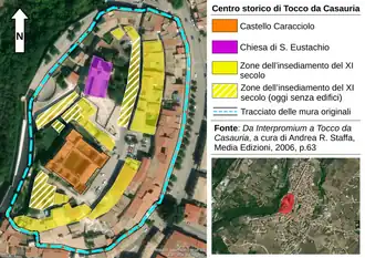 The emergence of the village of Tocco is linked to the process of medieval encastellation by which local and ecclesiastical lords sought to gain greater power and control over territories, with the territory of Tocco in particular being the subject of disputes between local rural lords of Germanic origin and the nearby Abbey of San Clemente a Casauria,[11] in which the latter saw itself as the target of numerous territorial usurpations.[12] This contention led to the founding of several castles in the area used to assert power over the various territories.