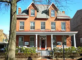 In 1762, Phineas Eachus was issued a license to build a tavern in what is now West Chester. It was apparently nameless until August 1768, when John Clark purchased the tavern and called it Turk's Head Inn. A small crossroads village developed around the tavern bearing the Turk's Head name.[2] On September 11, 1777, the Battle of Brandywine was fought several miles from the Turk's Head village. A schoolhouse, located at what is now High and Gay Streets, served as a hospital for recovering Colonial soldiers. A small skirmish between the British and Colonial troops took place shortly after the battle.[3]