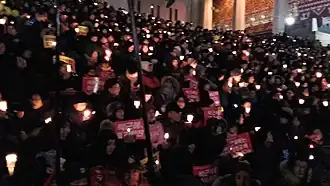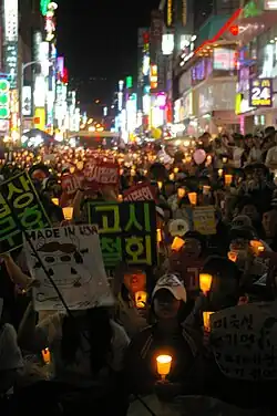 In South Korea, candlelight rallies,[1] also referred to as candlelight struggles,[2] candlelight revolutions,[3] or candlelight cultural festivals are attended with a humorous props and banners along with candles.[4] Candlelight protests[5] are symbolic collective gatherings of political dissent in South Korea to combat injustice peacefully.[6] This method of protesting began in 1992 for opposing the charging of online service. After that in 2002, as a result of the Yangju highway incident,[1] then utilized in the rallies against the impeachment of Roh Moo-hyun in 2004, re-used again in the 2008 U.S. beef protests, and emerged in the 2016-18 President Park Geun-hye protests.[7]