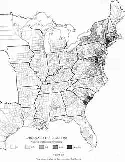 Location of churches in 1850; note strength along Atlantic coast and weakness inland; from U.S. Census.