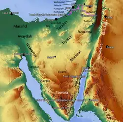 According to the testimony of al-Jaziri, the Wuhaydat were still connected to the Banu Attiya in the mid-16th century and lived, among other places, in the area around Aqaba.[71] Additionally, there is some evidence suggesting that they were present in the Negev as an identifiable tribe up to three centuries earlier: according to the oral traditions of the Banu Uqba and the Masa'id, who migrated to the Negev together (see above), the Wuhaydat were already present when they arrived.[98] If this is accurate, the Banu Attiya/Wuhaydat, after having migrated northward in the 13th century, seem to have passed by the Banu Uqba and the Masa'id (see above) and continued further into the Negev even before them. After the Masa'id interlude, it was the Wuhaydat who replaced the Jarm as the dominant tribe in the southern central Negev[99] in the late Mamluk or early Ottoman period.[100] In the 19th century, parts of the Wuhaydat were a sub-tribe of the Jabarat, other parts a sub-tribe of the Tarabin,[101] and in the early 20th century, Musil reported Wuhaydat "living with the Tiyaha."[102]
