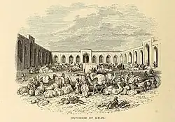 Both variations are relevant for the Negev. Along the desert routes, ḥimaya was institutionalized: The Mamluks ensured safe passage for caravans by constructing inns ("khans")[109] – including in the northern Negev[110] – and entrusting the dominant Bedouin tribes with the task of managing these khans and the right to provide caravan ḥimaya.[111][112][113][114][115]