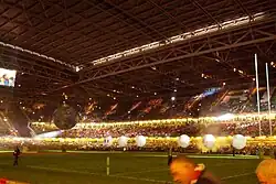 Originally scheduled for 2012, England and Wales, with games also in Ireland and France, hosted the 14-team 2013 World Cup, which has been considered the most successful tournament to date.[20] The tournament was moved very early in its organisation to 2013 due to the United Kingdom hosting the 2012 Summer Olympics.[21] The tournament opened with a double-header at Cardiff's Millennium Stadium, with debutants Italy beating Wales 32–16 before Australia defeated England 28–20 in front of 45,052 fans.[22] This crowd was the largest opening day crowd and the largest rugby league crowd in Wales. The tournament also saw the largest rugby league crowd in Ireland, with 5,021 watching Ireland go down to Australia 50–0 at Limerick's Thomond Park. Another success story of the tournament was the United States making the quarter-finals on their tournament debut, before succumbing to Australia 62–0. The semi-finals were played at Wembley Stadium, with 67,545 people attending the double-header, with New Zealand defeating England 20–18 thanks to a last minute try by Shaun Johnson before Australia defeated Fiji 64–0 directly after.[23] The final was then played at Old Trafford, where Australia won their tenth World Cup, defeating New Zealand 34–2 in front of 74,468 people, the largest international rugby league crowd of all time.[24]