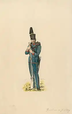 Following the Treaty of Belgrade (1739), the šajkaši bands in Komarno, Esztergom, Györ and other places were disbanded and in 1763 the Frontier Šajkaši Battalion (Serbian: Крајишки шајкашки батаљон, romanized: Krajiški šajkaški bataljon), known in German as czaikisten-bataillon, in Southeast Bačka was founded by the Habsburg War Council. The Serbian šajkaši became an integral component of the Austrian Danube fleet and so much so that following the Austrian conquest of Hungary and present-day Vojvodina, the Šajkaška province in modern-day Serbia was founded. Active between 1763 and 1873, the Serb colonising community which was employed into the battalion (šajkaši) was given the Šajkaška region, which initially included six villages and eventually increased by eight. The battalion headquarters were in Titel. The battalion had four bands in 1769, with 1,116 men, although it was constantly expanding.[2] The modern day traditional Serbian šajkača hat is believed to be derived from the 18th-century Banat based Frontier Šajkaši Battalion uniform.[3]