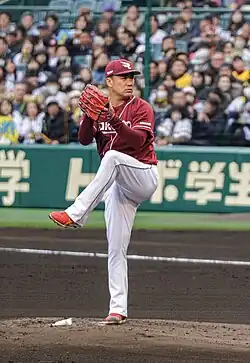 The Eagles' first real signs of improvement came during the 2007 season, the team's third. First baseman and designated hitter Takeshi Yamasaki led the league in home runs through May and was named the Pacific League MVP for the month of May, the team's first.[35] Yamasaki, as the top vote-getter overall, went on to be selected by fans to the Pacific League All-Star team for the 2007 All-Star Series. With one of the All-Star games being played at the Eagles' home stadium that year, fans also voted in seven other Rakuten players, including rookie pitcher Tanaka. The Eagles were the first PL team to have eight players selected for the All-Star team since 1978.[36] Nomura was critical of the fans' selections, stating that not all of his players selected were worthy of being named All-Stars.[37] Rakuten finished the season with a losing record, however, for the first time they did not finish the season last, instead finishing fourth.[30] At the end of the season, Yamasaki led the league in both home runs and runs batted in (RBIs) and Tanaka was awarded the Pacific League Rookie of the Year Award.[38][39] In the off-season, the team's president since its inception, Toru Shimada, acquired ownership of the team.[40] Additionally, Nippon Paper acquired the naming rights to Miyagi Stadium, and the park was renamed Kleenex Stadium.[41] The team finished fifth next season, however, Iwakuma finished with the best earned run average (ERA) and most wins in the league after struck by injuries the previous few years.[42][43] At season's end, he was presented with his and the team's first PL Most Valuable Player (MVP) and Eiji Sawamura Awards.[42]