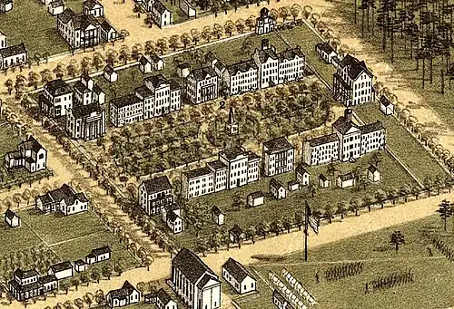 An 1872 illustration of the Horseshoe, USC's original campus. The Maxcy Monument is in the center
