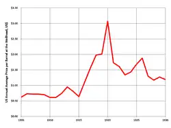 The high price of petroleum encouraged intensified exploration in the US and elsewhere, and eventually resulted in the discovery of large new petroleum deposits. American oil production surged in the early 1920s, particularly in north Texas and the Los Angeles Basin in California, driving down both imports and the price of oil.[27] A barrel of oil in the Midcontinent region lost almost two-thirds of its value, falling from US$3.50 at the start of 1921, to US$1.25 at year-end.[28] Imported oil peaked at 127 million barrels in 1923, then dropped by more than half, to 62 million in 1925.[17]