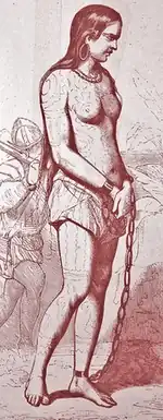The naguas were a long cotton skirt that the woman made. The native women and girls wore the naguas without a top. They were representative of each woman's status, the longer the skirt, the higher the woman's status.[8][11] The villages of the Taínos were known as "Yucayeque" and were ruled by a cacique. When a cacique died, the next in line to become a chief was the oldest son of the sister of the deceased cacique. Some Taíno women became notable caciques (tribal chiefs).[6] According to Puerto Rican folklore such was the case of Yuisa (Luisa), a cacica in the region near Loíza, which was later named after her.[12]
