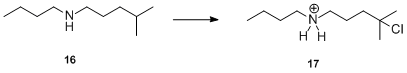 Tendency for 3° vs. 1° hydrogen migration was studied with n-butylisohexylamine 16. When 16 was subjected to the standard reaction conditions, rapid disappearance of 16 was observed, but no pyrrolidine product could be isolated. This result suggested that there is a high selectivity for the 3° hydrogen, but the intermediate tertiary chloro compound 17 is rapidly solvolyzed.
