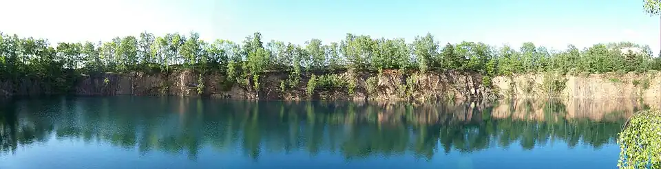 The Hohburg Hills were shaped by decades of intensive stone quarrying. This produced steep rock faces and several lakes in the hollows that were left behind. The rock faces, up to forty meters high, have been used for climbing since 1925. Climbers from the area, such as Felix Simon, made use of the terrain as a training ground for the Alps. Many of the climbs used in those days fell victim to ongoing quarry operations. From 1965, the Schwarze Wand ("Black Wall") has been used for Alpine training (aid climbing). Since the mid-1990s, many, new, very difficult routes have emerged as part of a further wave of development. Currently, there are over 500 climbing routes in various quarries.[1]