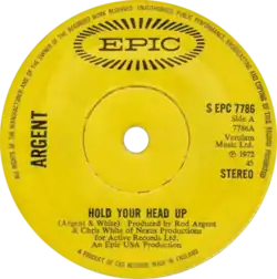 "Hold Your Head Up" is a song by the English rock band Argent, first released as a single in 1971. The song was a Top 5 hit in the US, the UK, and the Canadian charts, peaking at No. 5 in all three countries. However, it was the band's only song to chart on the Billboard Hot 100.[3] Billboard ranked it as the No. 50 song for 1972. The song appeared on the third Argent album All Together Now (1972).