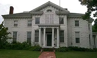 Built with weatherboarded walls, the two-story house features a small single-story portico over the entrance. The house's central section is divided into three bays: windows fill the side bays on both stories, while the central bay is occupied by an entrance on the first floor and a larger window on the second. This section of the house rises to a gable centering on a small fanlight, while the house's brackets and cornice form a pediment at the top of the gable.[3] A similar portico is placed on the house's western side. Another distinctive component of the architecture is the weatherboarding: although made of wood, the house's exterior has been shaped to resemble the appearance of ashlar decorated with quoins. These elements, together with the house's blockish shape, combine to give it the appearance of an Italianate residence with Neo-Renaissance influences.[2]
