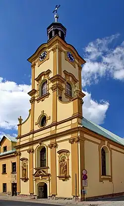 The façade is decorated by figures of Saint Francis of Assisi and St Joseph with Baby Jesus (located in the hemispherically vaulted niches), most probably due to the person of the emperor Francis Joseph I, listed on the renovation plague inside the church on the left hand side from the entrance.[4] In the church there is also a wooden Baroque gallery, built after 1784 and a Baroque pulpit in the Baroque and classicistic style.[3]