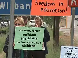 In opposition of the prosecution of home schoolers in Germany, the Association for Homeschooling holds a protest at the Deutsche Schule in Pretoria to bring this to the attention of the German community.[11]