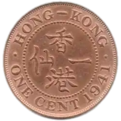 The one-cent coin was the smallest-denomination coin of the Hong Kong dollar since 1866 until its replacement in 1941 by the one-cent note. During World War II the loss of coins dated 1941 along with their subsequent melting during the Japanese occupation of Hong Kong has resulted in the survival of no more than 100 coins.