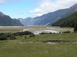 The Hopkins River (Māori: Te Awa Aruhe)[2][3] is in the central South Island of New Zealand.[4] It flows south for 45 kilometres (28 mi) from the Southern Alps / Kā Tiritiri o te Moana into the northern end of Lake Ōhau in the Mackenzie Country.[5]
