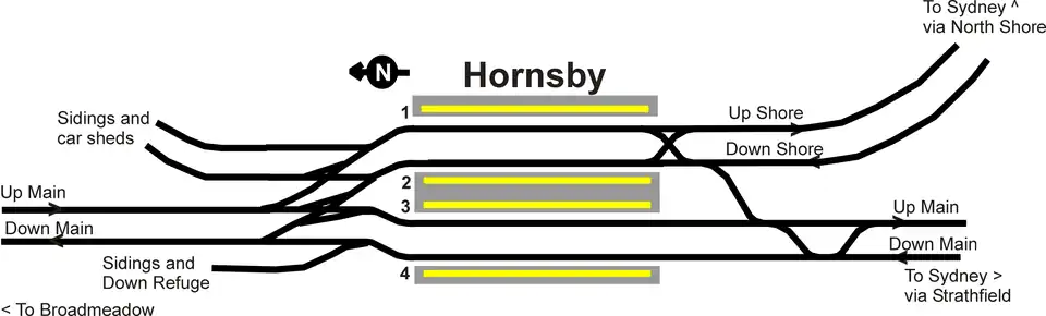 On 1 January 1890, Hornsby became a junction station with the opening of the North Shore line to St Leonards. In 1894, a third platform was built along with a locomotive depot to the east of the station.[5] Hornsby was the northern extremity of the electrified network from 1930 until it was extended to Gosford in 1960. The wires did continue north of the station as far as the Hornsby Maintenance Depot.