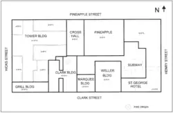 East of the Tower Building were the six-story Crosshall Building and the eight-story Pineapple Building. The Crosshall Building had a 50-foot (15 m) frontage on Pineapple Street, while the Pineapple Building was located at 60 Pineapple Street and had a 115-foot (35 m) frontage; both buildings were 90 feet (27 m) deep.[9] The easternmost 115 feet (35 m) of the block was the "St. George Hotel Building", the only operating portion of the hotel by the 1990s. The structure had a frontage of over 200 feet (61 m) on Henry Street, extending the entire block between Pineapple and Clark Streets; it rose eight stories on Pineapple Street and twelve stories on Clark Street. The hotel had entrances from Clark and Henry Streets, and the New York City Subway's Clark Street station was accessed from the lobby.[9]