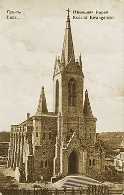 Following annexation to the Russian Empire in 1795, Volyn was colonised by Germans thanks to the encouragement of the Russian government which sought to extend agriculture and industry. The German colonies grew rapidly in the 1870s and 1880s. As most Germans were Lutherans, permission to build a new church was sought from the Lutsk authorities who made the site of the former Carmelite church available.