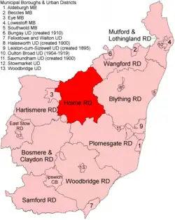 Hoxne Rural District was a rural district within the administrative county of East Suffolk between 1894 and 1934. It was created out of the earlier Hoxne rural sanitary district.[1] It was named after the historic hundred of Hoxne, whose boundaries it closely matched. The hundred, in turn, took its name from the village of Hoxne.
