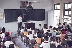 A primary class displaying Hua's portrait next to Mao's, 1978