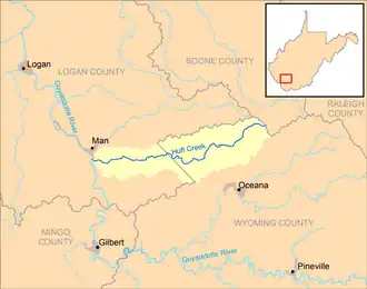 Huff Creek is a tributary of the Guyandotte River, 21.2 miles (34.1 km) long,[3] in southern West Virginia in the United States. Via the Guyandotte and Ohio rivers, it is part of the watershed of the Mississippi River, draining an area of 52 square miles (130 km2)[4] in a rural area on the unglaciated portion of the Allegheny Plateau. The creek was named after Peter Huff, an early settler.[5]