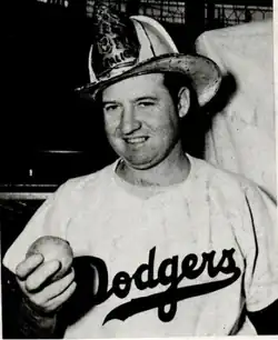 Casey was used mostly as a reliever in 1942 and led the league in saves.[2] In January 1943, during World War II, Casey entered the United States Navy.[4] He was discharged in December 1945.[4] Upon his return to the Dodgers, he had two good seasons in 1946 and 1947. In 1947, Casey led the National League in saves for the second time.[5] He pitched well in the 1947 World Series, going 2–0 with a save, but the Dodgers lost in seven games.