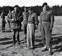 He completed a parachute training course and qualified as a glider pilot. In May 1943, promoted to acting Brigadier, Kindersley was appointed Commanding officer of the 6th Airlanding Brigade.[1] It was on his recommendation that Major John Howard and D Company 2nd Oxfordshire and Buckinghamshire Light Infantry (the 52nd) were selected to lead the coup de main operation at Pegasus Bridge and Horsa Bridge before the Allied invasion of the Normandy beaches began. Kindersley commanded 6 Airlanding Brigade, part of 6th Airborne Division, during the Normandy landings on D Day, 6 June 1944, landing at 03.30 hours with 6 Airborne divisional headquarters. He was later wounded during the Battle of Bréville, and evacuated to England. Brigadier Edwin Flavell replaced him as commanding officer of 6 Airlanding Brigade.
