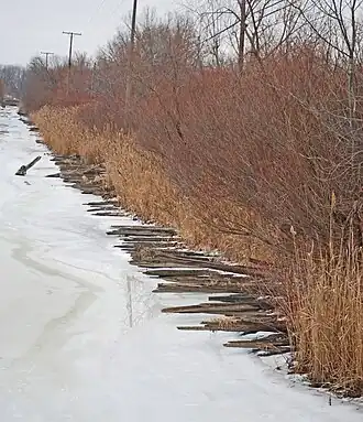 The North Huron River Corduroy Segment of Hull's Trace is located along the west side of Jefferson Avenue, just north of the Jefferson Avenue–Huron River Bridge. This corduroy road segment consists of a series of logs oriented approximately horizontally, emerging from the Jefferson Avenue embankment near the water level of Silver Creek. Around 600 logs are included in the exposed section of the trace, spread out in a broken sequence over a distance of approximately 1,250 feet (380 m). Some logs still exhibit axe marks. The logs are of similar diameter and lie parallel to each other.[4]