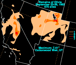 Flooding caused $500,000 (1982 USD) in damage in Washington County.[22] Olivia was the wettest-tropical cyclone in Utah on record, dropping a peak precipitation amount of 7.41 inches (188.21 mm), in Cottonwood Weir.[23] Damages in Utah were estimated to be between $13–25 million (1982 USD).[20]