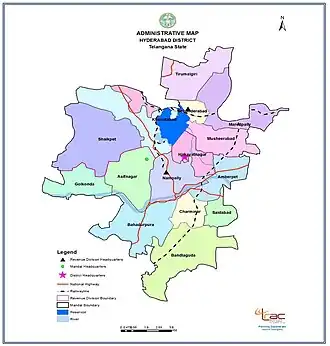 Hyderabad District includes the area of the core area Greater Hyderabad Municipal Corporation, Secunderabad Cantonment, and Osmania University. There are 16 administrative areas called mandals (or tehsils) in Hyderabad. They are:[7][8]