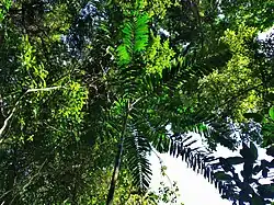 H. wendlandiana grows to a height of 25 m (82 ft) with 3 to 7 stems up to 12 cm (4.7 in) in diameter.[4][6][8] The sparse crown has 5 to 10 paripinnate fronds measuring up to 2 m (6 ft 7 in) in length, with up to 20 praemorse pinnae (leaflets), on either side of the slightly arching rachis (midrib).[4][6][8] The leaflets are sessile and irregularly spaced, and may be up to 45 cm (18 in) long by 6 cm (2.4 in) wide, dark green on the upper surface and lighter below. The apical leaflets are merged at the base and are much broader than the rest.[6][8]