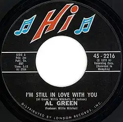 "I'm Still in Love with You" is a song originally recorded by Al Green. Released from the album I'm Still in Love with You, the single spent two weeks at number 1 on the Hot Soul Singles chart in August 1972. It also peaked at number 3 on the Billboard Hot 100 singles chart that same year. It would eventually sell over one million copies and is considered one of Green's most popular songs.[2] Billboard ranked it as the 59th best selling song of 1972.[3]