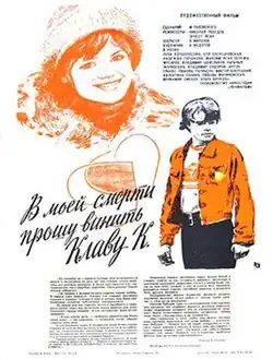I Ask to Accuse Klava K. of My Death (Russian: В моей смерти прошу винить Клаву К., romanized: V moey smerti proshu vinit Klavu K.) is a 1979 Soviet teen film directed by Nikolai Lebedev and Ernest Yasan based on the eponymous story by Mikhail Lvovsky.[1][2]